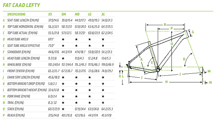 | Frame | Fat CAAD, SmartFormed Alloy, BB30XL, 1.5 Si head tube |