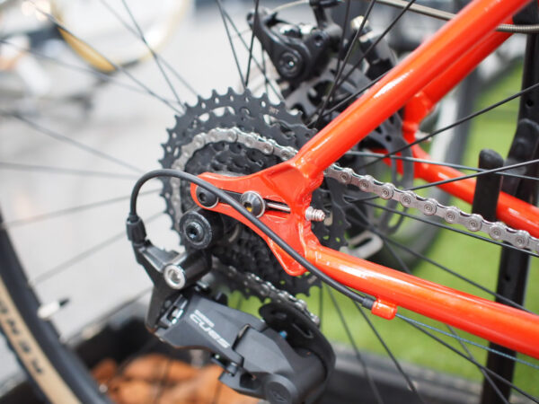 プロトタイプなのでタイヤクリアランスが大分ギリギリですが、700cとして展開されます。従来モデルが650B前提のジオメトリだったので、そこが変わります。
