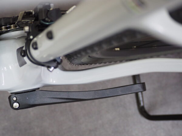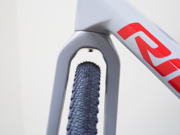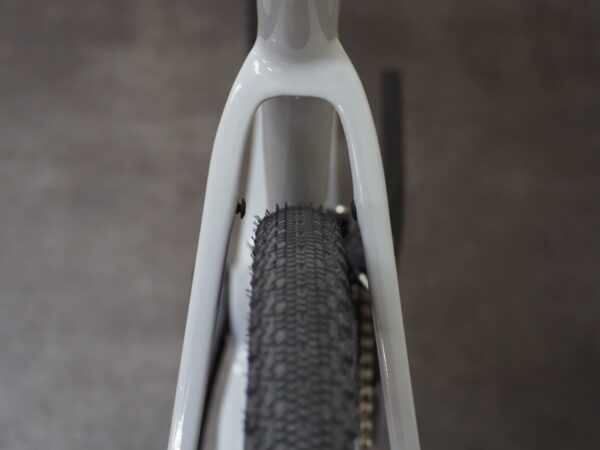 タイヤにフロントディレイラーが干渉するそうでフロントダブルで組む場合は700x38mmが最大タイヤ幅、フロントシングルで組む場合は700x40mmまで装着可能なんだそうです。