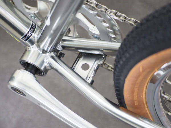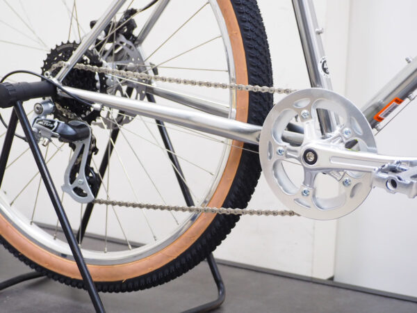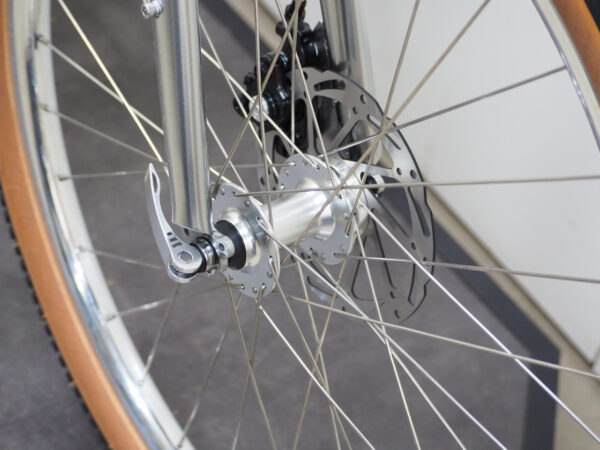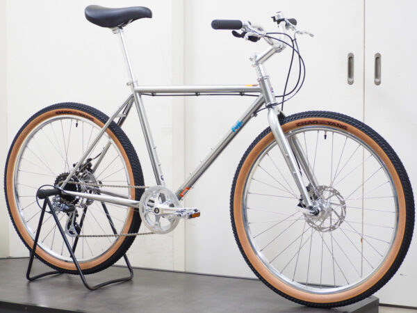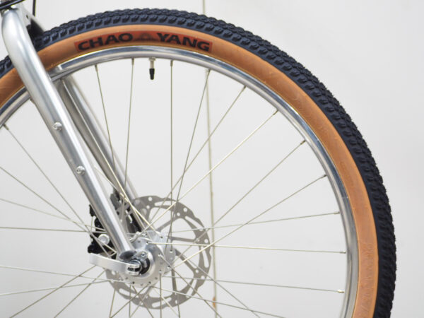 シルバーポリッシュのリムにTANサイドのタイヤが付きます。