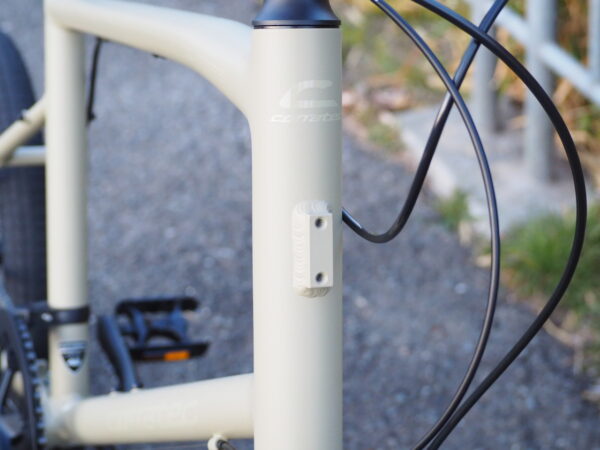 長めのヘッドチューブには、キャリアをマウントするための穴があります。