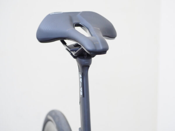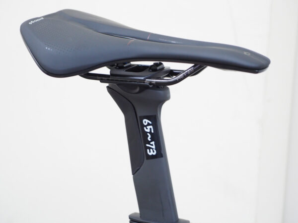 しかしトップチューブがホリゾンタルに近いのと、シートポストにもダンパがついていて、下げ代に制限がありますので、目安身長の下限よりもサイズ感はややデカいと思ってください。