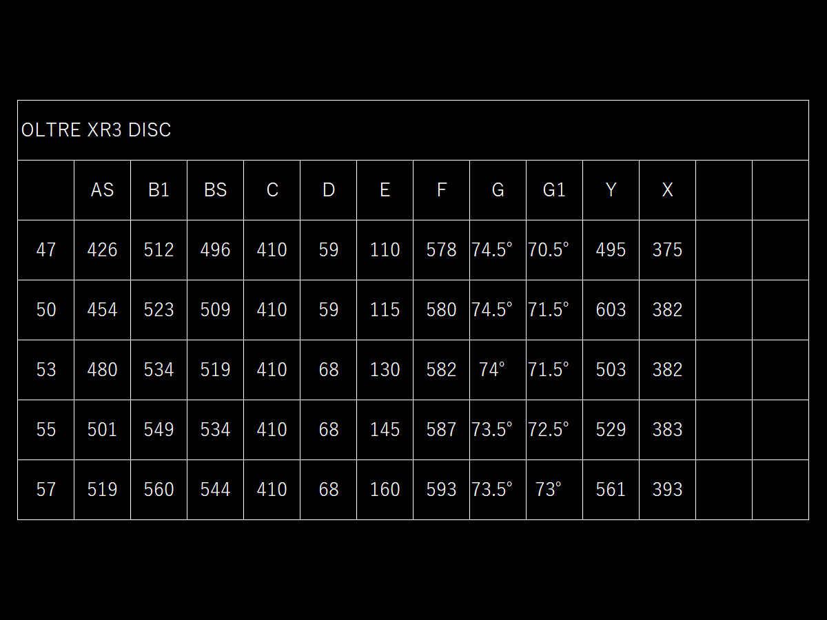 ジオメトリはOLTRE XR4と同じかと思いきや少し違います。ヘッドチューブの長さが少し長いです。各サイズおよそ5mm程度。これはトッププロに供給されるOLTRE XR4に乗るライダーより、アマチュアライダーの方が前傾姿勢が少し浅いからです。
