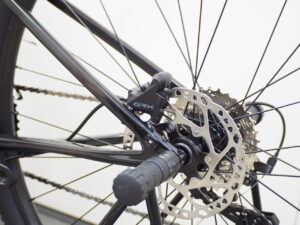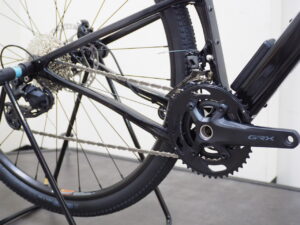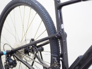 リアにKING PINサスペンションの構造を持たせる事により、後輪が跳ねにくいので舗装路を走る時でもスムーズな空気圧でグラベルに入っても跳ねてトラクションを失いにくくしています。