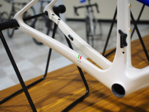 フレーム素材にハイモジュラス30T+40Tカーボンを使用し剛性も備えつつ未塗装時で850グラムと軽量に仕上がっております。