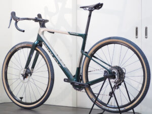 バイクです。グラベルやトレイルといったオフロード⾛⾏を想定して、⾛⾏性能と快適性を兼ね備えるためMTB 志向のジオメトリーを採⽤。