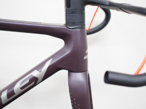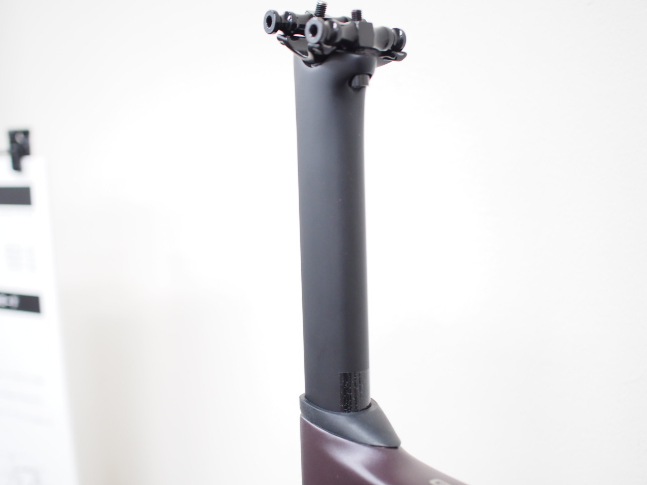 リアホイールに沿ったエアロダイナミクス形状のシートチューブや空⼒特性に優れたD 型形状のシートポストも採⽤。42mm のタイヤクリアランスを設けており、32mm のロードタイヤから42mm のグラベルタイヤまで使⽤⽬的に合わせて装着が可能です。⼀般的に42mmあれば多くのグラベルで⼗分な使⽤が可能と証明されており、より低い空気圧で⾛⾏できるメリットがあります。